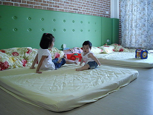 他的房間是木板床,超大的,房裡還擺了一些玩具跟故事書,讓人有在家的舒適感